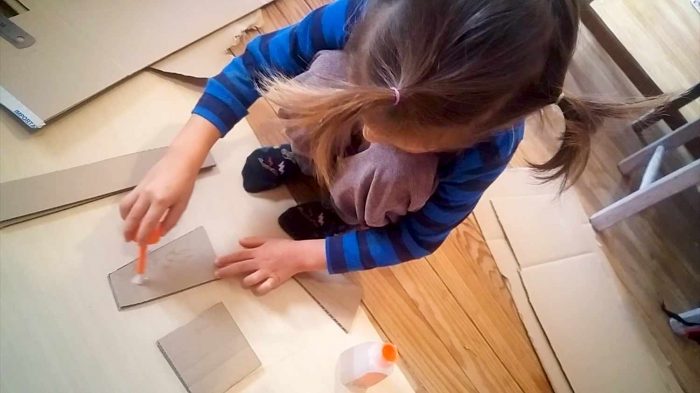 Le carton est un matériau très sympa à utiliser avec les enfants car il est très facile à couper, à percer, à coller, il est léger, ne fait pas de poussière. Bref, c’est top! Pas besoin d’outils particuliers pour le travailler et en plus vous pouvez vous en procurer très facilement. Pour ma part, je le prends dans les Biocoop où ils sont soit à disposition, soit disponible en demandant aux employés.