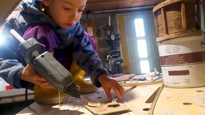 L’objectif n’était donc pas qu’il fasse tout de A à Z mais qu’il participe un peu à chaque étape : traçage, perçage, collage, assemblage,…..