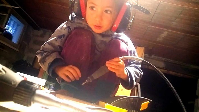 Ensuite, Milo ne les manipule pas directement sur la construction en cours mais d’abord sur des chutes de bois ou objets divers afin de se familiariser à leur maniement et d’être suffisament précis et sûre de lui lorsqu’on le fera pour nos créations.