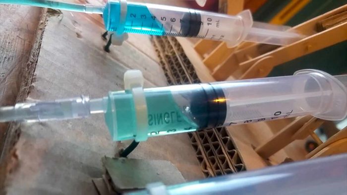 Pour ne pas confondre les différents leviers du bras, on utilise du colorant alimentaire pour colorer l’eau des seringues. Là aussi, nous faisons d’abord des tests en faisant différents mélanges dans de petits récipients. Cela permet à l’enfant de découvrir comment créer de nouvelles couleurs et nuances à partir des 3 primaires (Bleu cyan, Rouge magenta, Jaune pour la peinture).