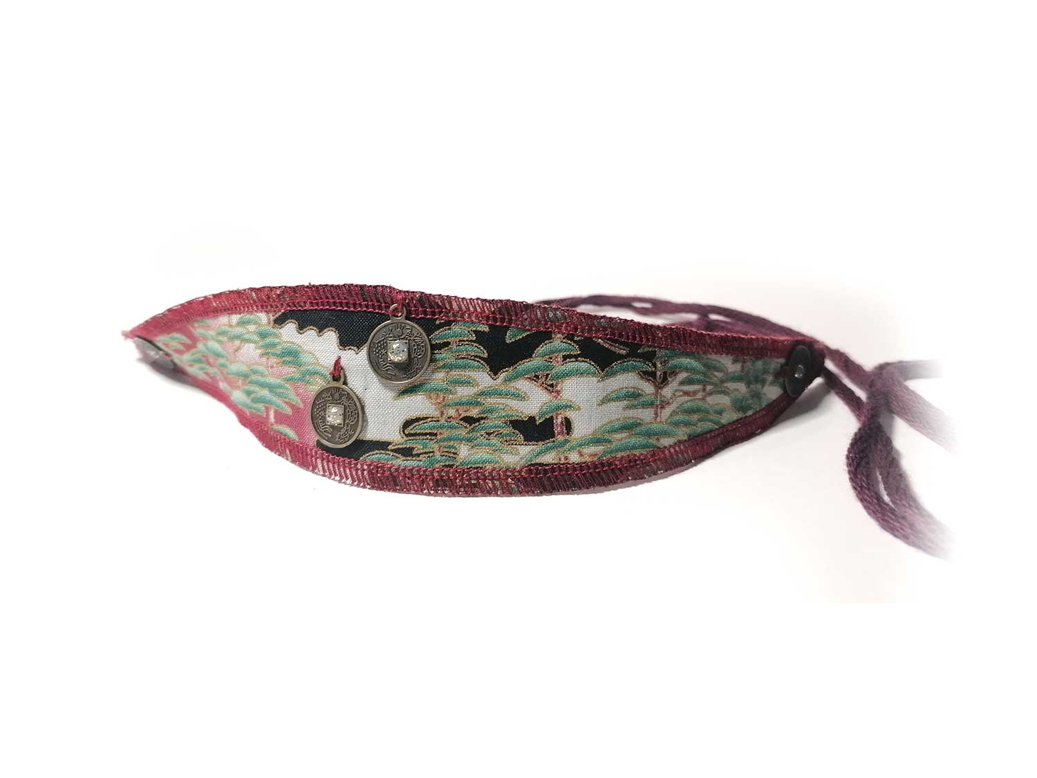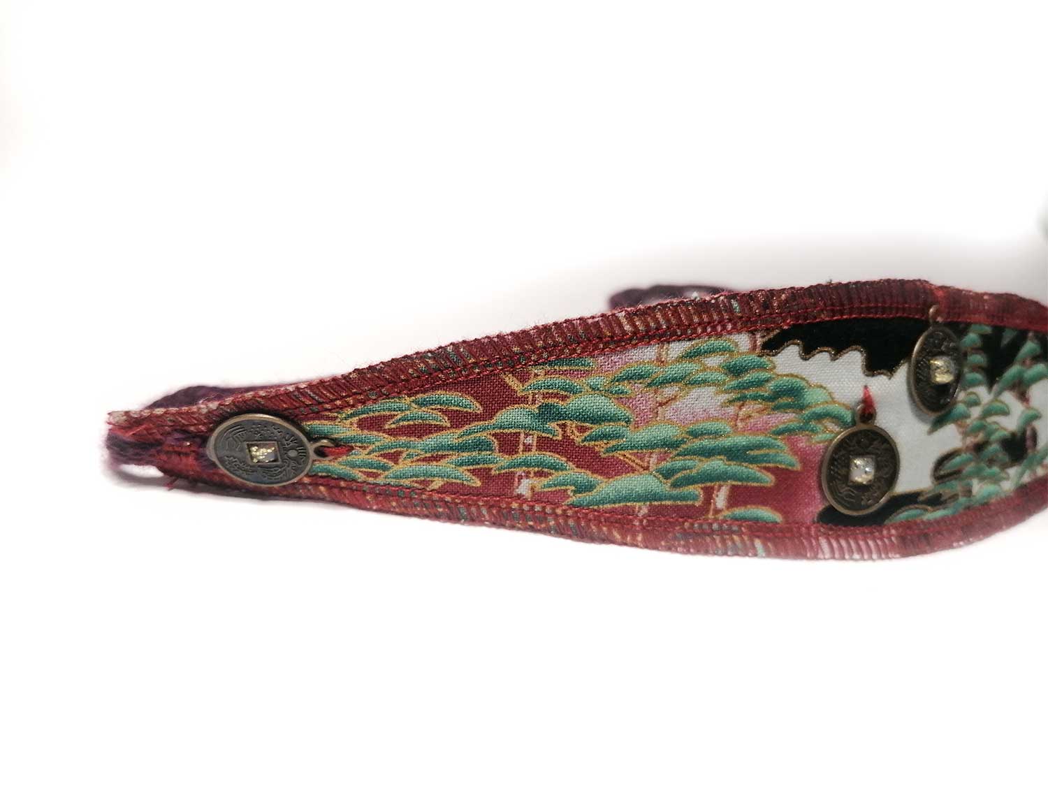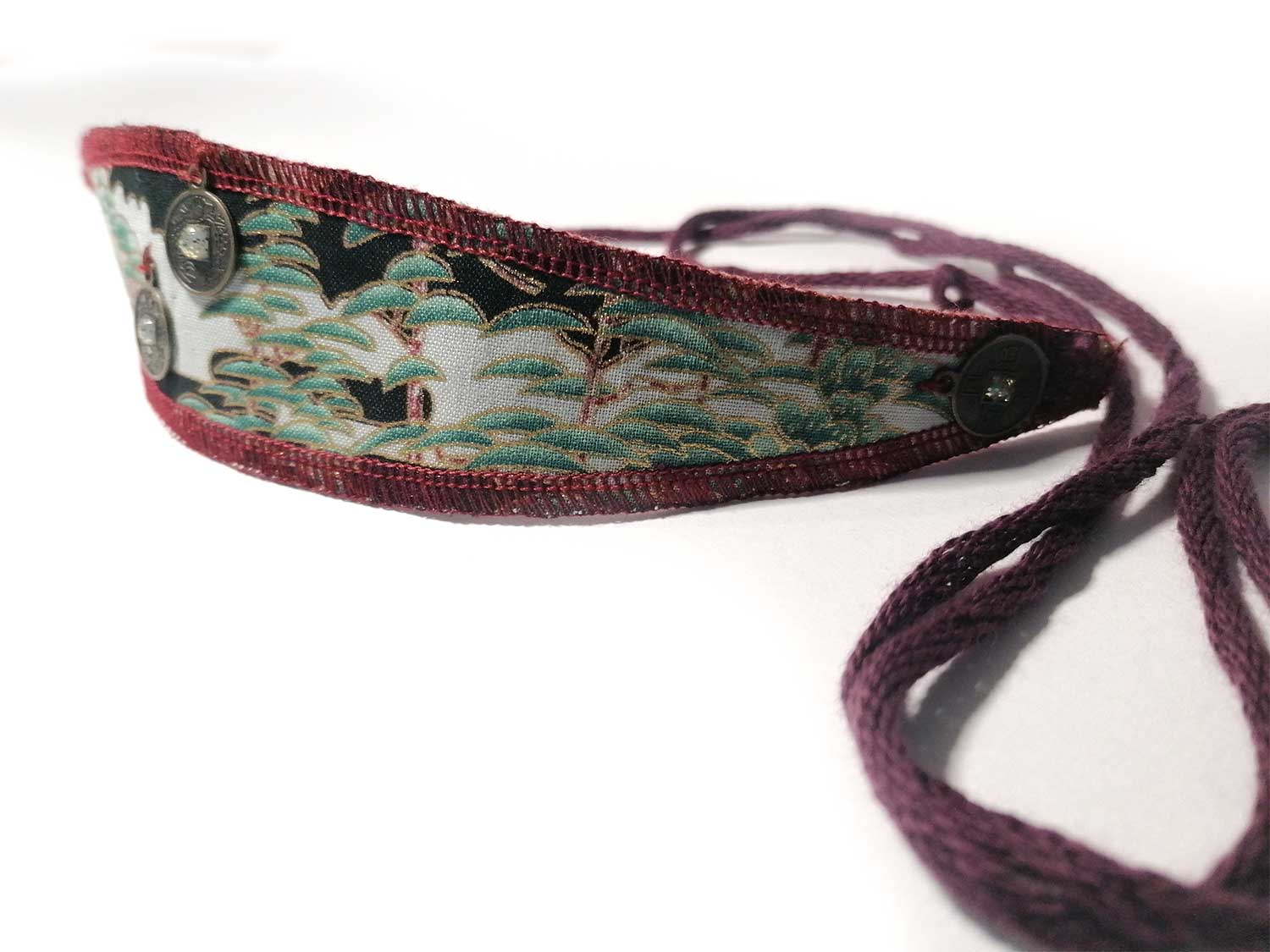 Tissu japonais en coton, avec un fil de coton bordeaux brodé pour le nouer, agrémenté de petites pièces dorées bronze.