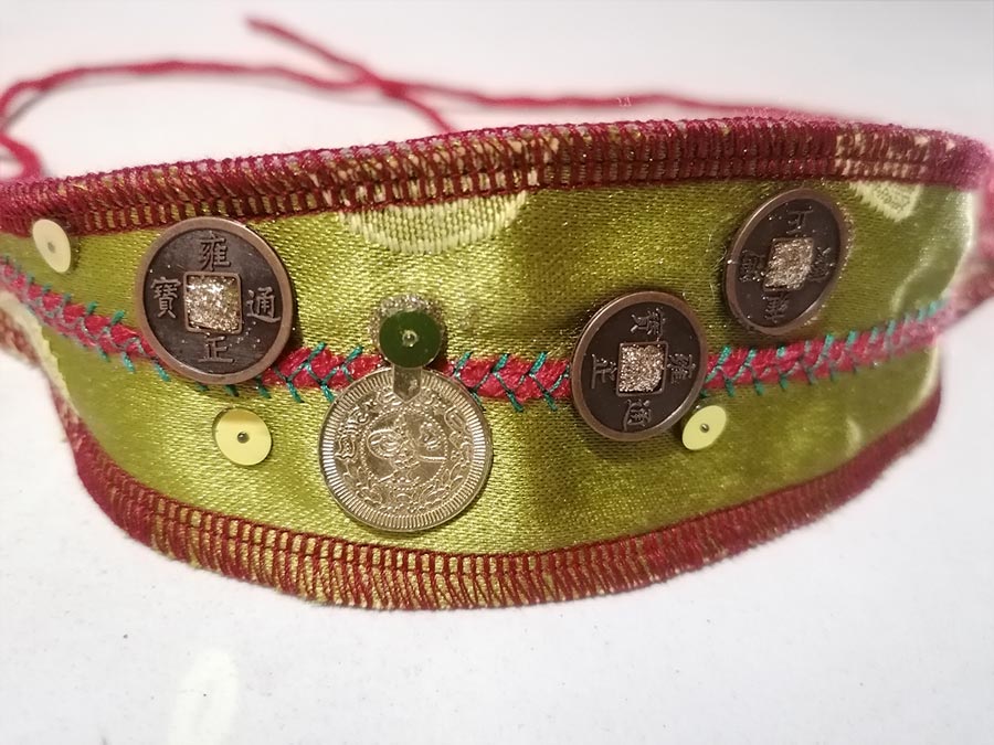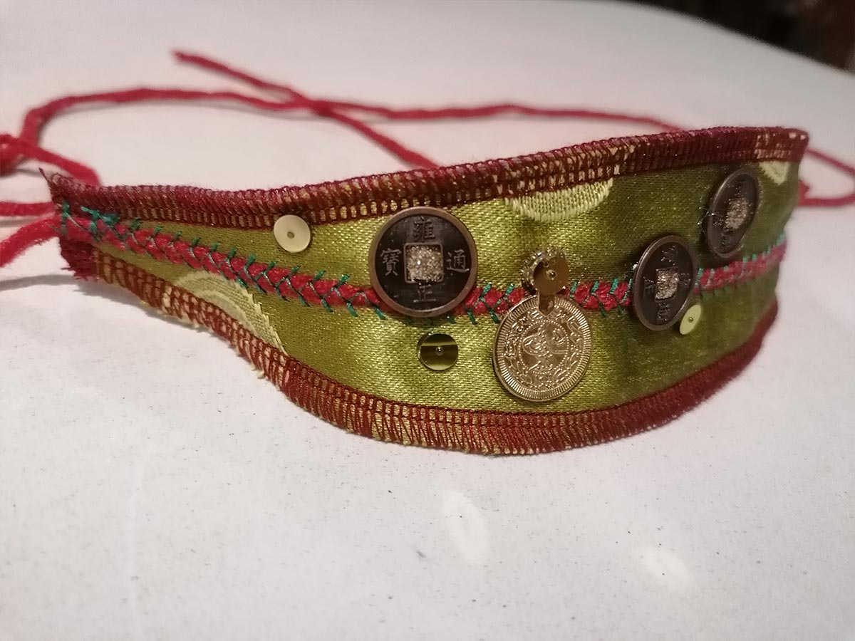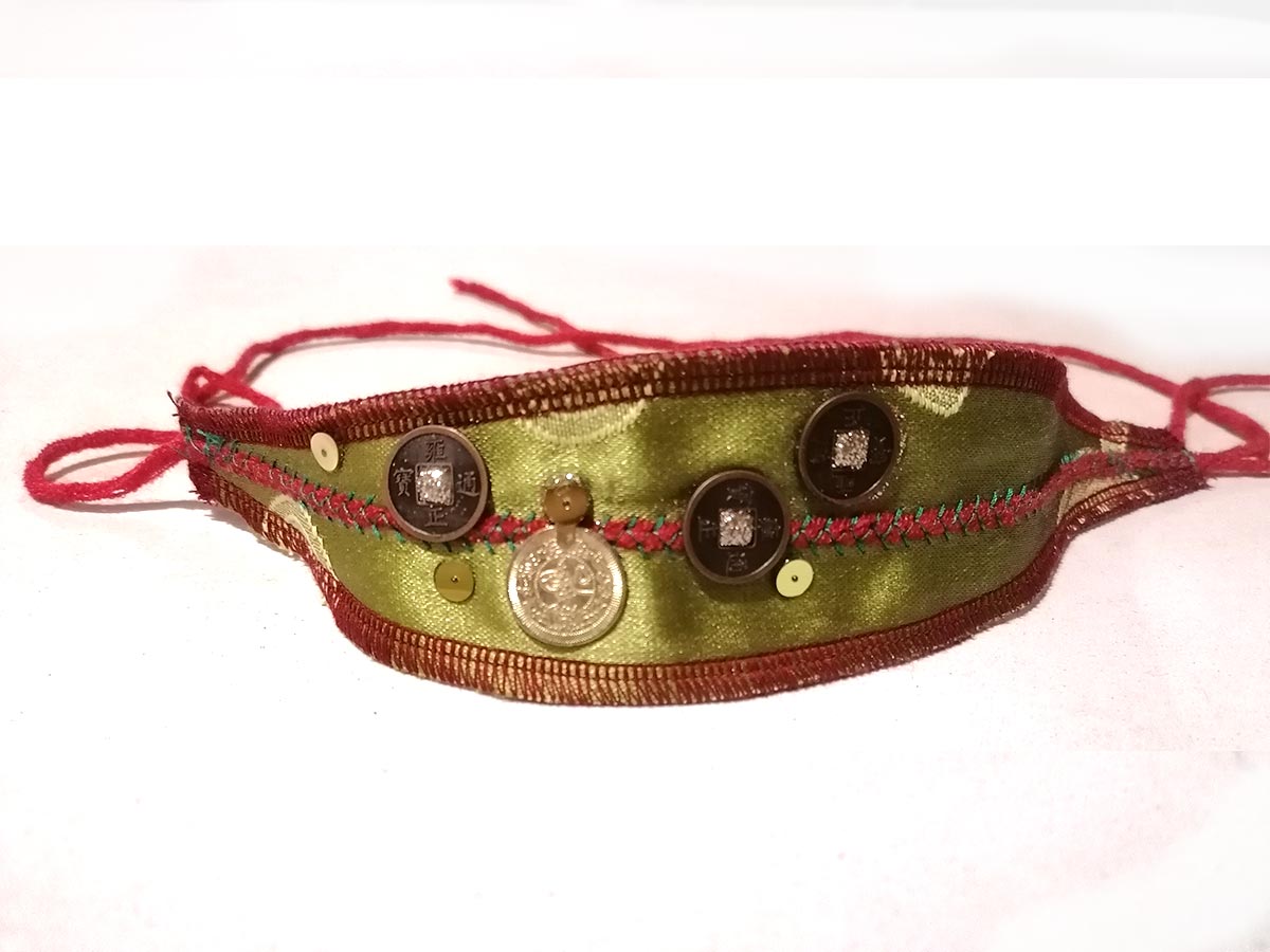 Satin vert bronze, avec un fil de coton rouge brodé pour le nouer, agrémenté de petits sequins et de pièces dorées et couleur bronze.